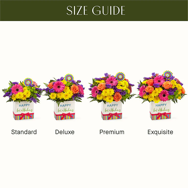 The Birthday Brights Bouquet is a true celebration of color and life to surprise and delight your special recipient on their big day! Hot pink gerbera daisies and orange roses take center stage surrounded by purple statice, yellow cushion poms, green button poms, and lush greens to create party perfect birthday display. Presented in a modern rectangular ceramic vase with colorful striping at the bottom, "Happy Birthday" lettering at the top, and a bright pink bow at the center, this unforgettable fresh flower arrangement is then accented with a striped happy birthday pick to create a fun and festive gift.