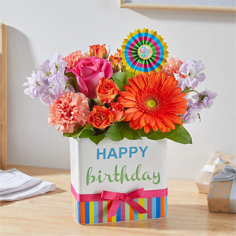 Surprise them with a gorgeous bouquet of orange, pink and lavender stems to make their special day unforgettable.Please note: The bouquet pictured reflects our original design for this product. While we always try to follow the color palette,, sometimes we may need to use a different vase.